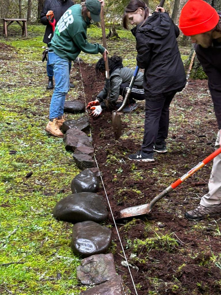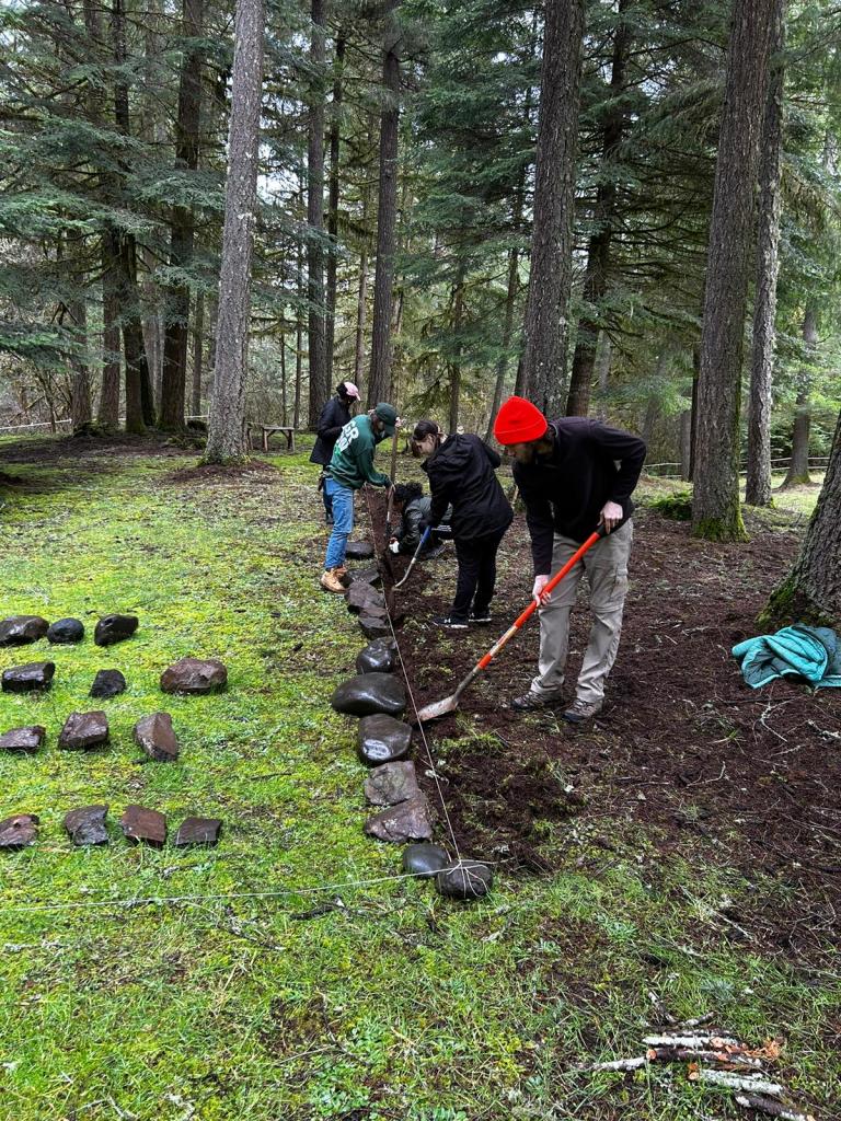 Over the course of several weeks in Winter 2023, we worked with volunteers to build our temazkal (kansi) and our batey – a ceremonial ground that originates with our Taino peoples. Sixteen of us, working together, built the kansi – digging the soil to set the poles, figuring out how to build, building the frame and then attaching all of the boards. Comprised of 80 ciba (stones/boulders), the batey is an important site for gathering with community.